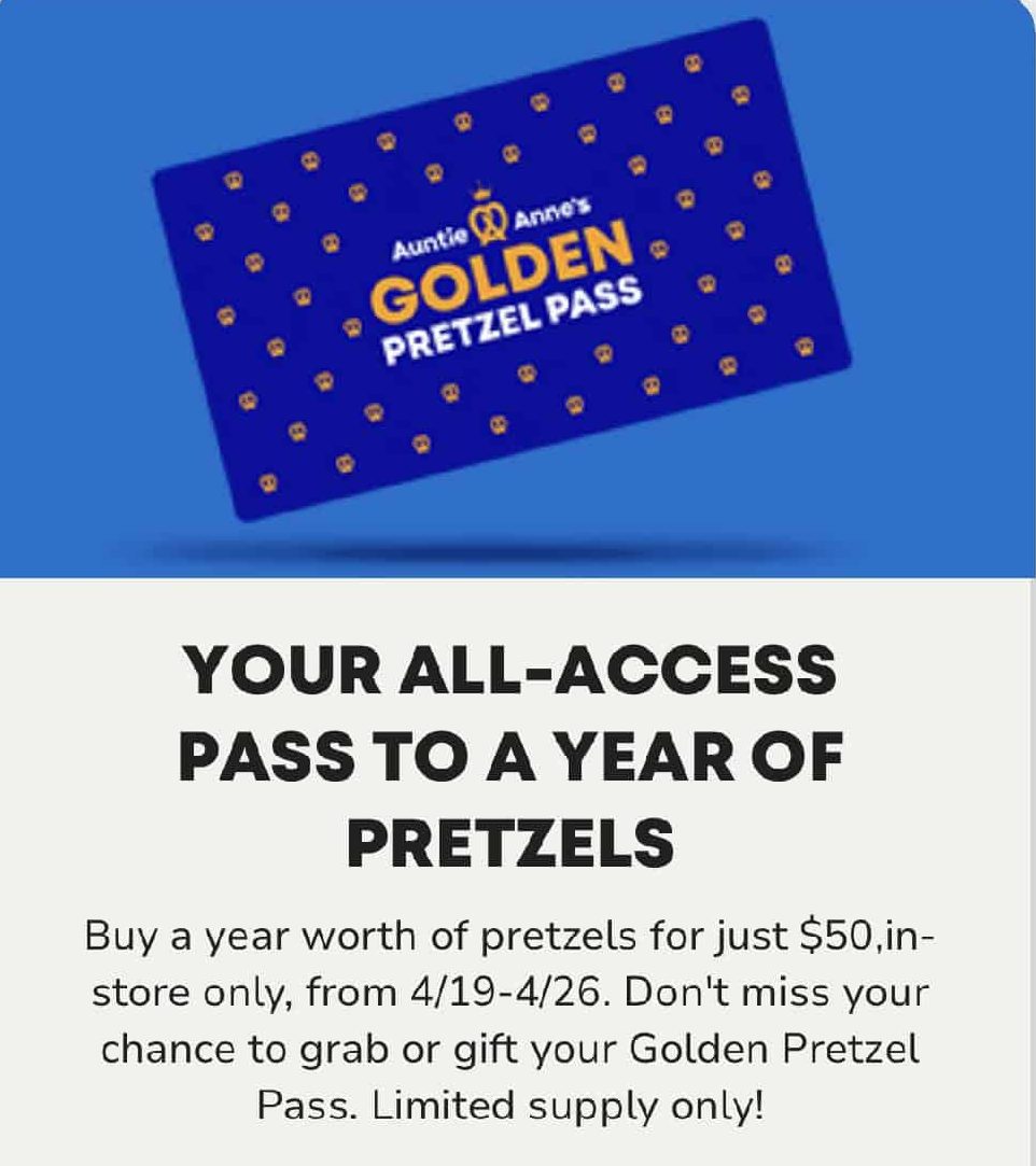 From April 19 to 26, 2026, pretzel fans can purchase Auntie Anne’s Golden Pretzel Pass for $50 at participating locations — while supplies last.