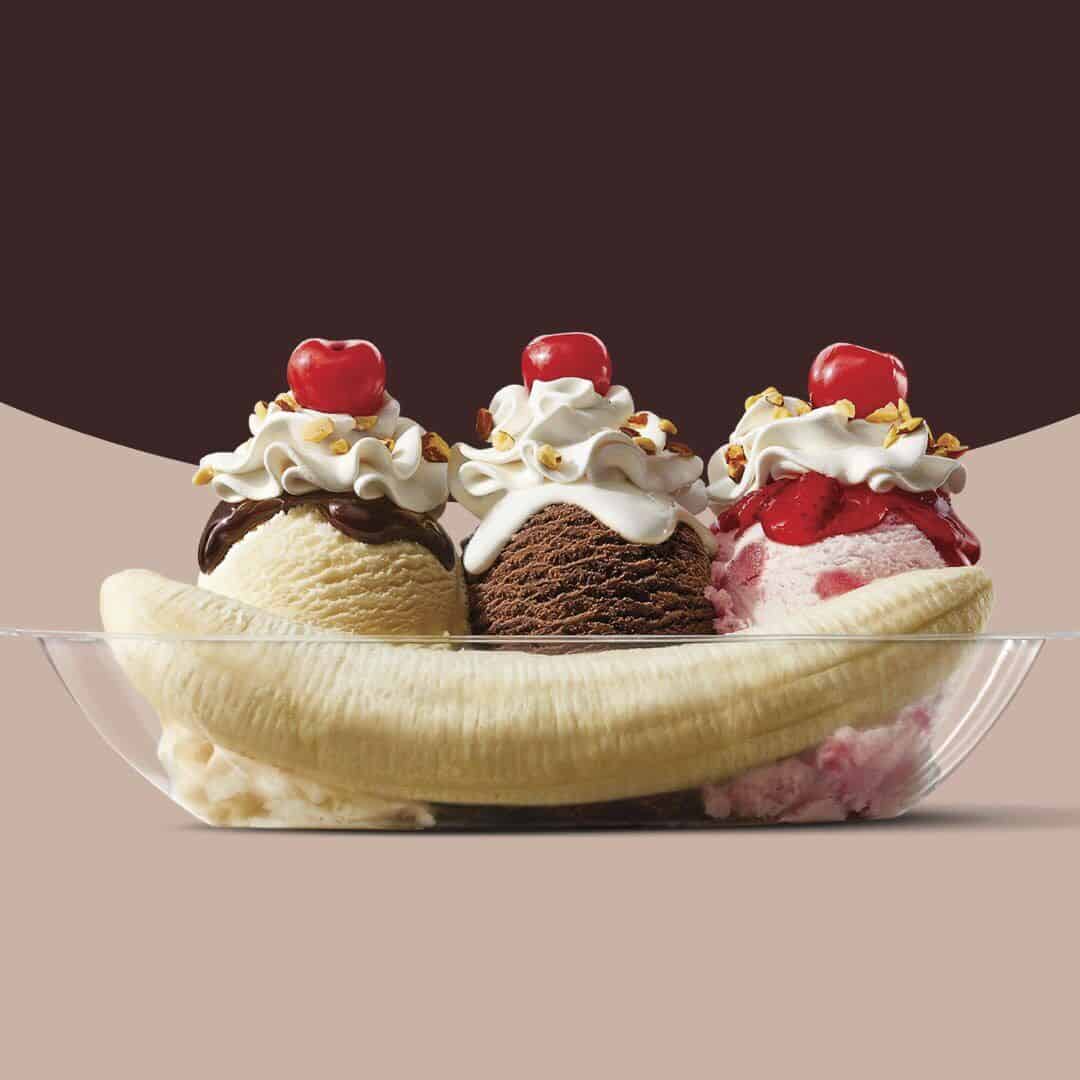The banana split includes three scoops of ice cream, two banana slices, three wet toppings —all crowned with whipped cream, chopped almonds and cherries. Topping selection may vary by shop.