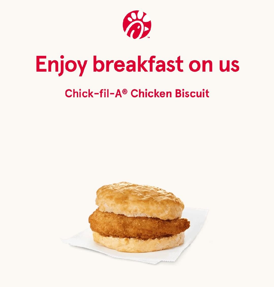 From February 17 to 28, 2026, Chick-fil-A is giving away a FREE Chick-fil-A Chicken Biscuit for breakfast at participating locations. No purchase necessary.