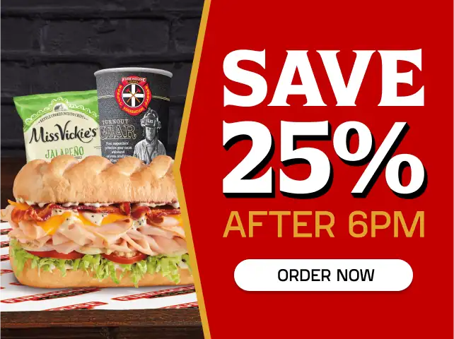 From Oct. 1 to 31, 2025, Firehouse Subs is offering 25% off an entire order (includes subs, sides and drinks!) from 6 p.m. to closing at participating locations.