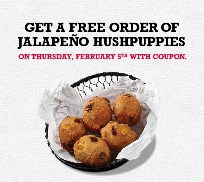 Today only (February 5, 2015), get a free order of Jalapeno Hushpuppies at participating Arby’s locations.