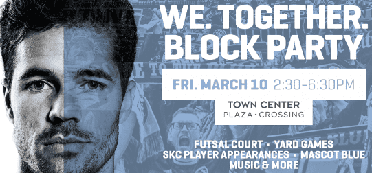 On Saturday, March 2, 2019, Sporting Kansas City is holding a Block Party on the north side of Town Center Plaza in Leawood (in the parking lot) to kick-off the team’s home opener. Admission is FREE.