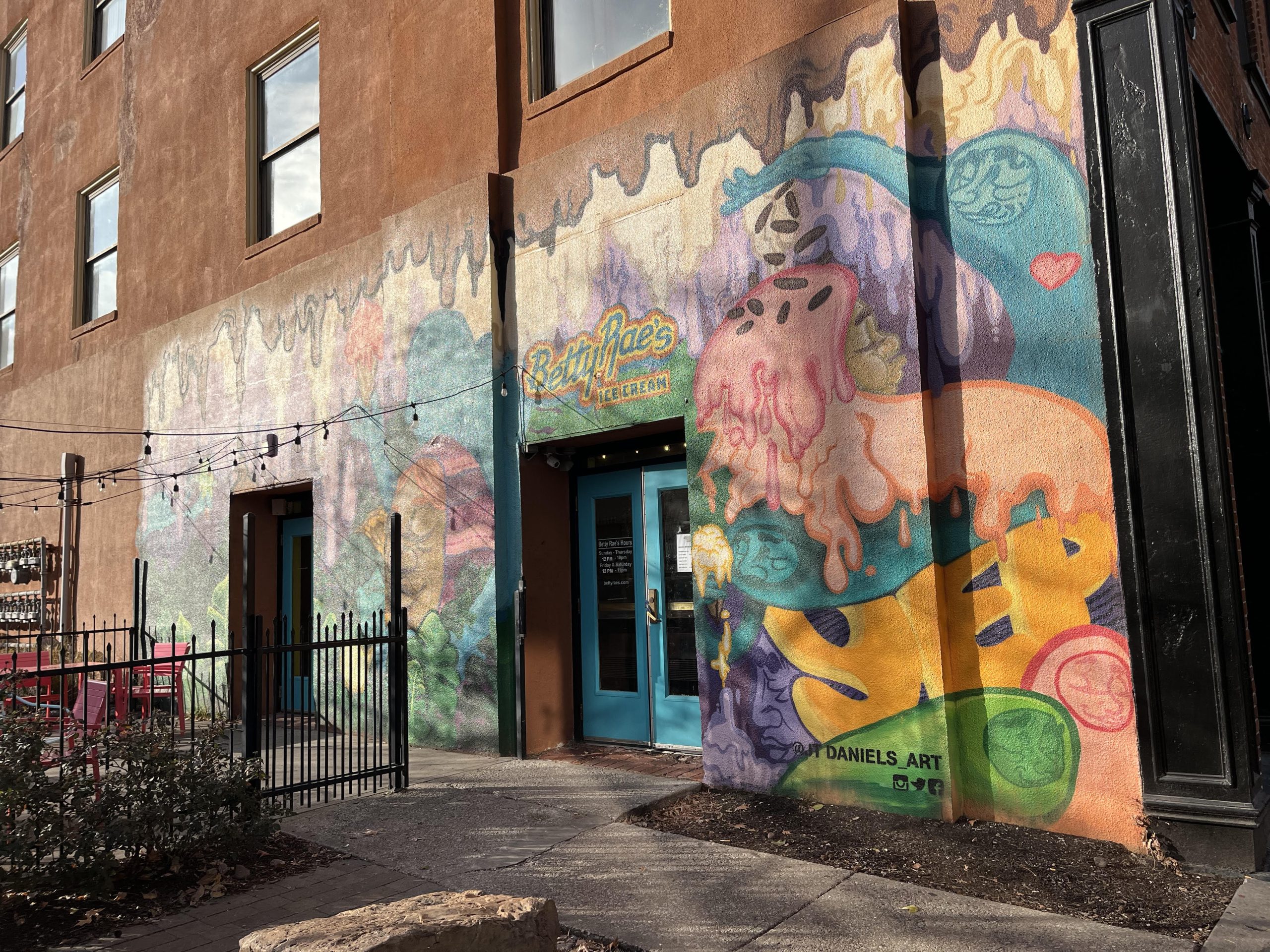 ๐ผ๏ธ JT Daniels Mural Art – 412 Delaware – Bright and vibrant, check out the difference the mural made on the side of the building to add interest and color and invite customers in to enjoy some ice cream. The artist has other murals in the River Market area. Find more ๐ผ๏ธ on this post. All part of the FREE Mural Scavenger Hunt!
