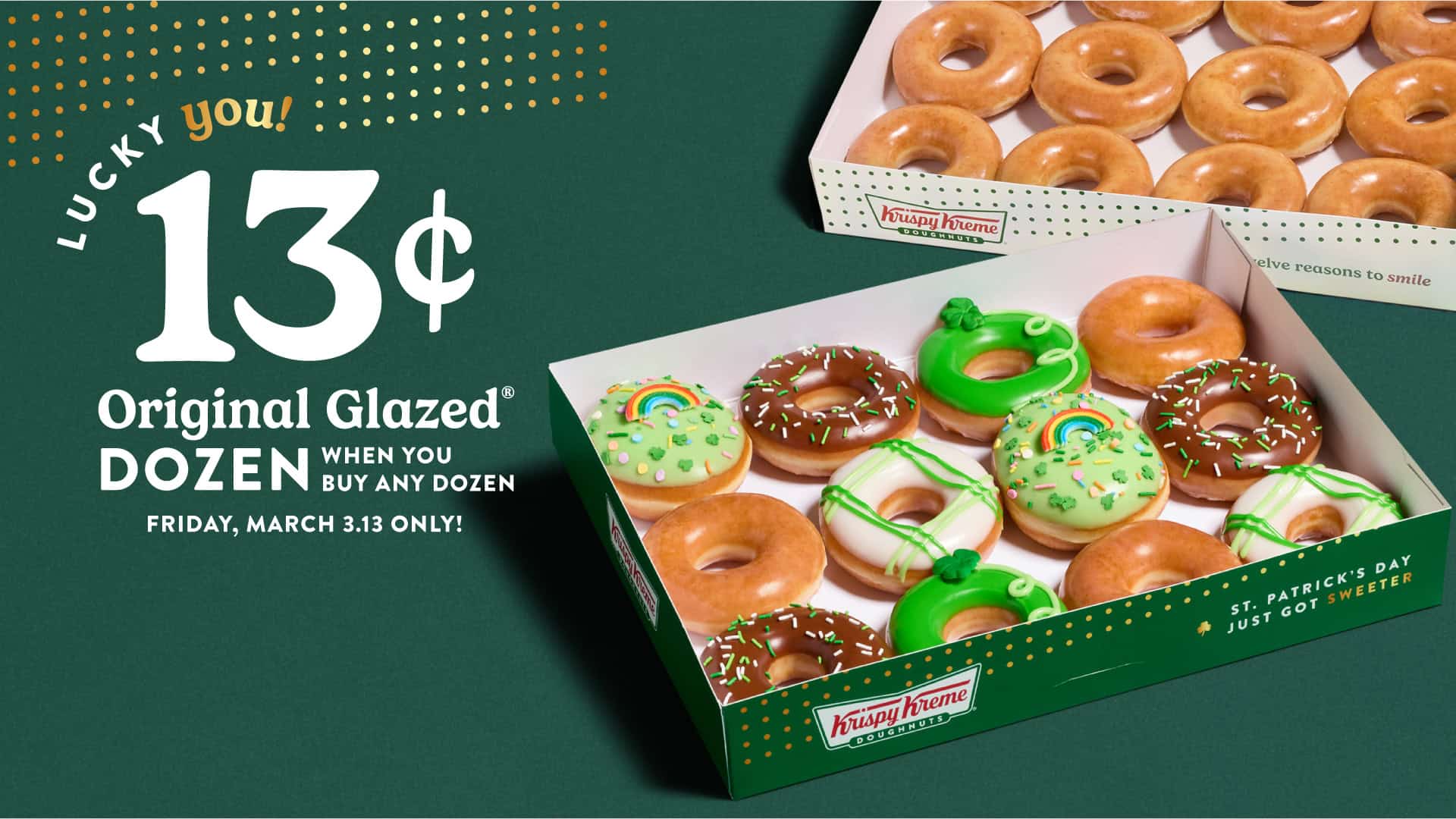 On March 13, 2026, Krispy Kreme is offering a dozen Original Glazed Doughnuts for just 13 cents with the purchase of any dozen at regular price at participating locations.