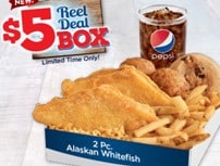 Long John Silver’s has a new Reel Deal Box promotion that’ll get you a $5 meal (limited time only). Your choices include 2-piece Alaskan Whitefish, 2-piece Chicken Tenders or Alaskan Whitefish and 3-piece Shrimp. Each box comes with natural cut fries, golden hushpuppies, a chocolate chip cookie and a drink. There’s no coupon required. Price and participation may vary.