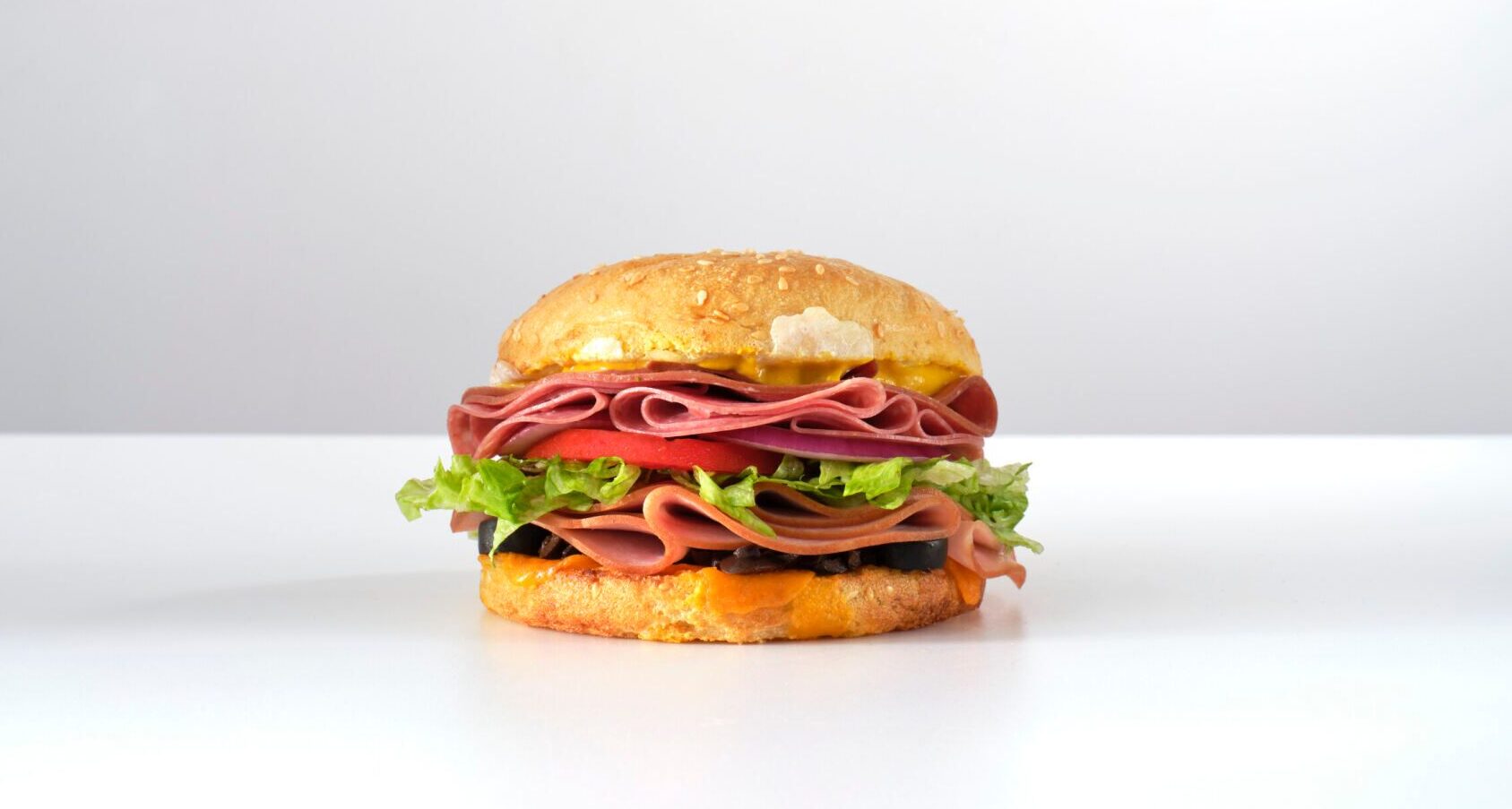 The Original Sandwich is made with ham, Cotto salami, Genoa salami, three cheeses, olives, lettuce, red onions, tomatoes, mustard and signature sauce — all on a sourdough bun.
